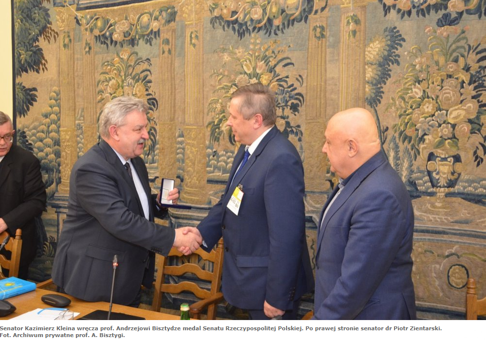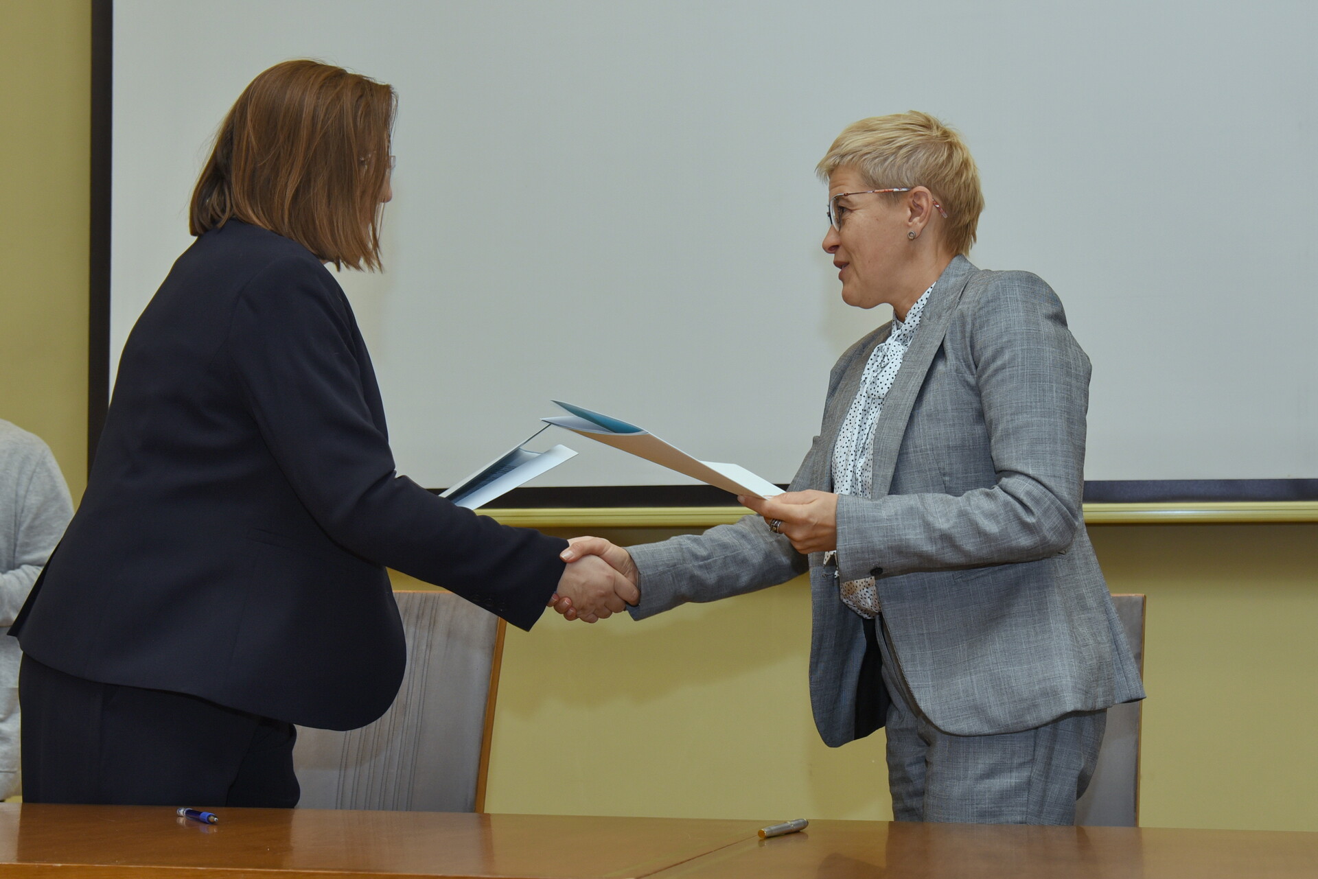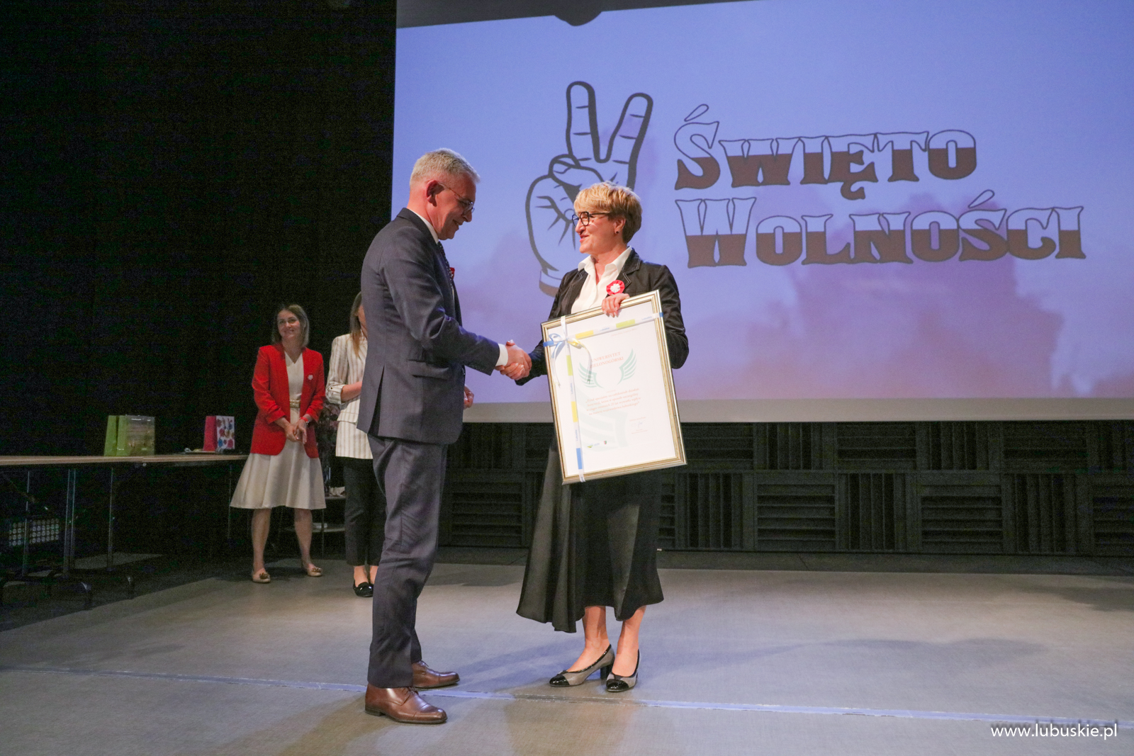 Rektor Uniwersytetu Zielonogórskiego - prof. dr hab. Wojciech Strzyżewski odbiera nagrodę dla Uniwersytetu Zielonogórskiego, wręcza ją Marszałek Województwa Lubuskiego - Elżbieta Anna Polak; fot. Urząd Marszałkowski Województwa Lubuskiego