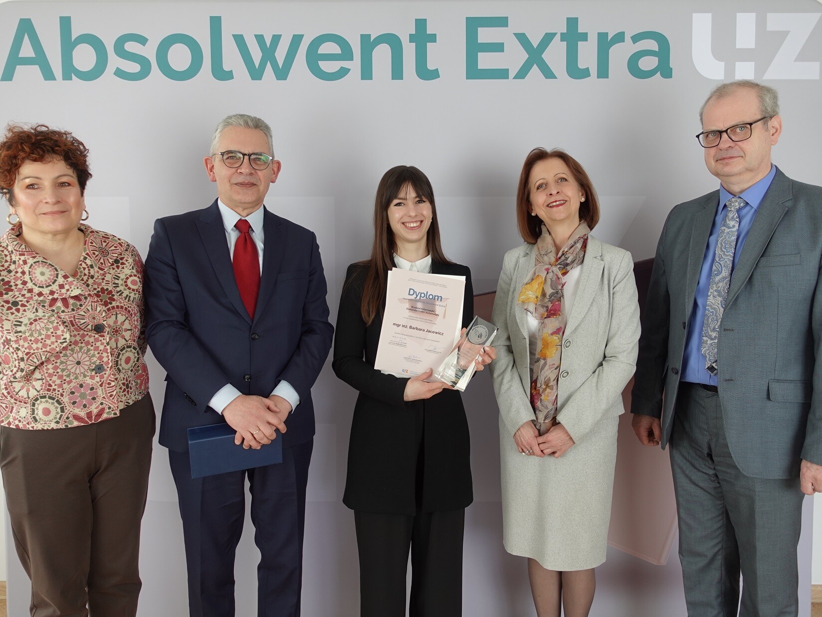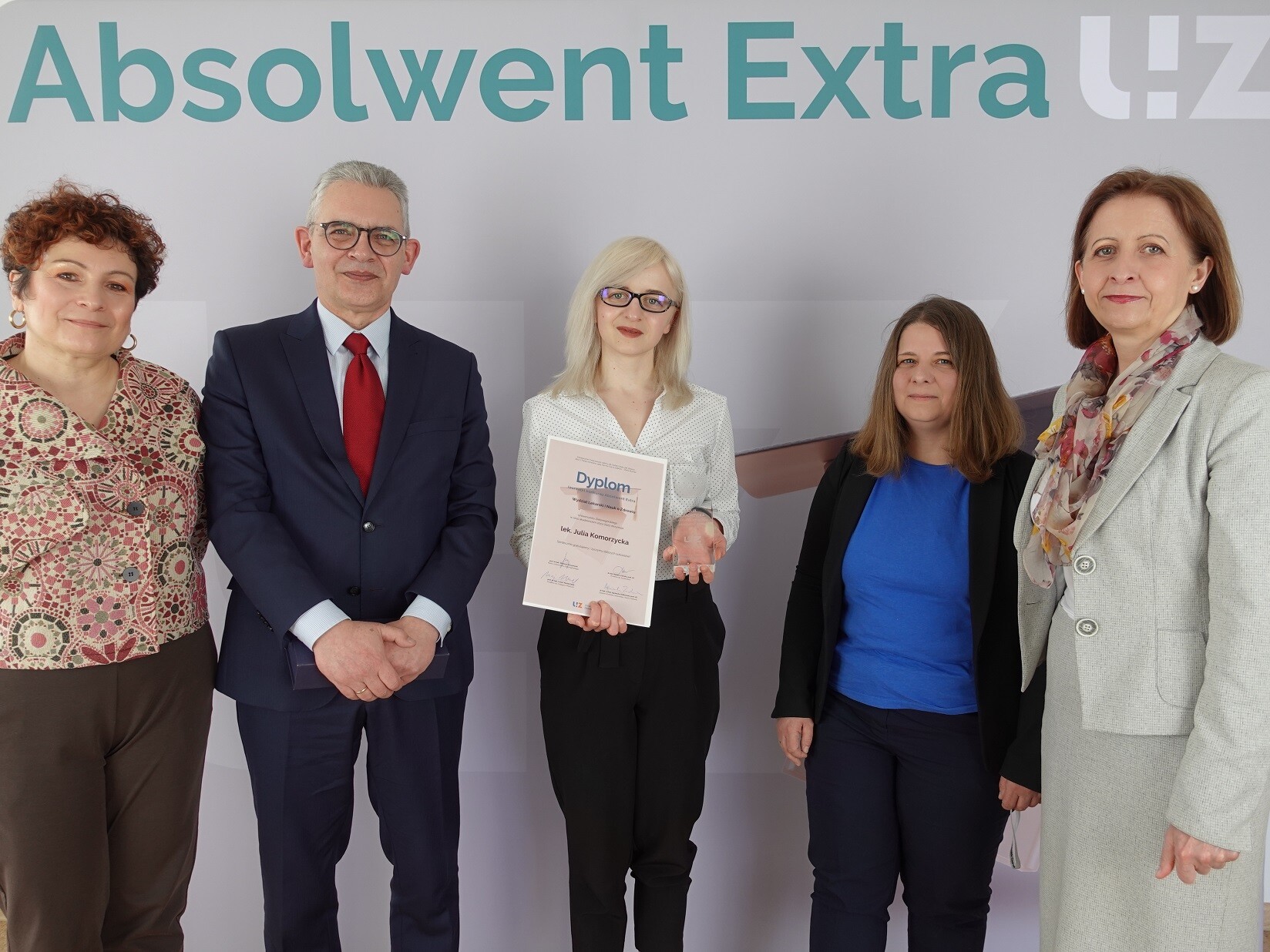 od lewej: Monika Politańska - kierownik Biura Karier UZ, prof. Wojciech Strzyżewski - rektor UZ, Barbara Markulak - Absolwentka Extra, prof. Barbara Literska - prorektor ds. studenckich UZ, prof. dr hab. inż. Andrzej Obuchowicz - dziekan Wydziału Informatyki, Elektrotechniki i Automatyki; fot. M. Leśniak