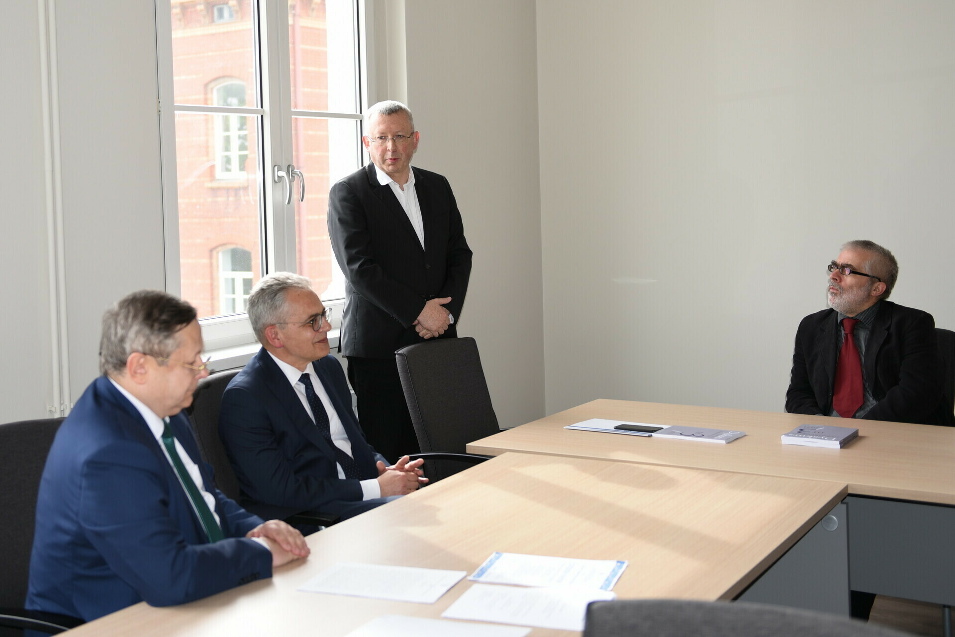 Od lewej: prof. Andrzej Bisztyga, Rektor UZ prof. Wojciech Strzyżewski, prof. Tadeusz Stanisławski, prof. Christof-Eric Mecke; fot. K. Adamczewski