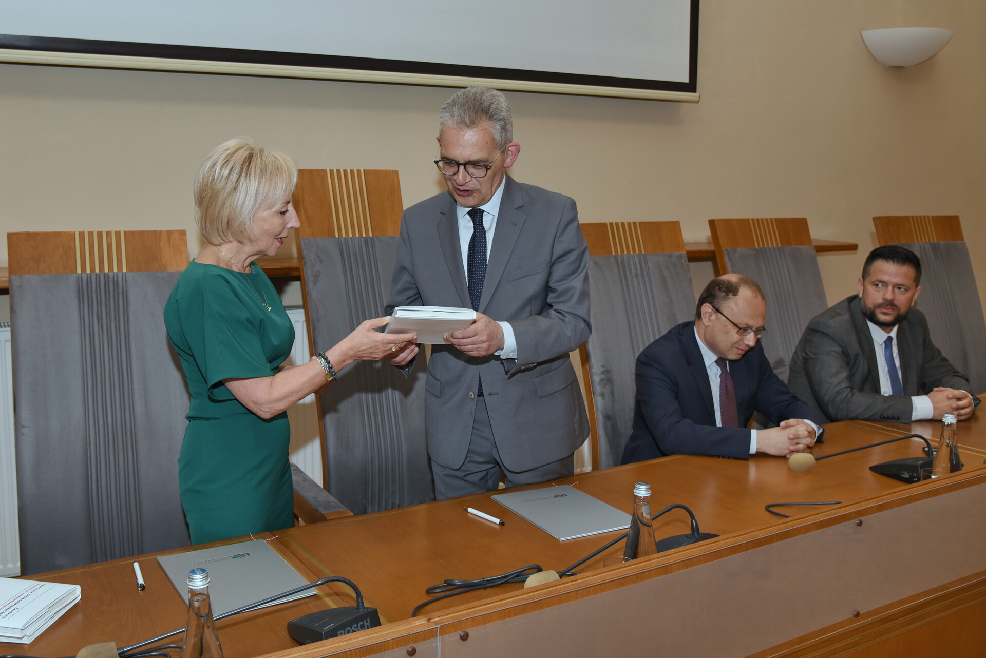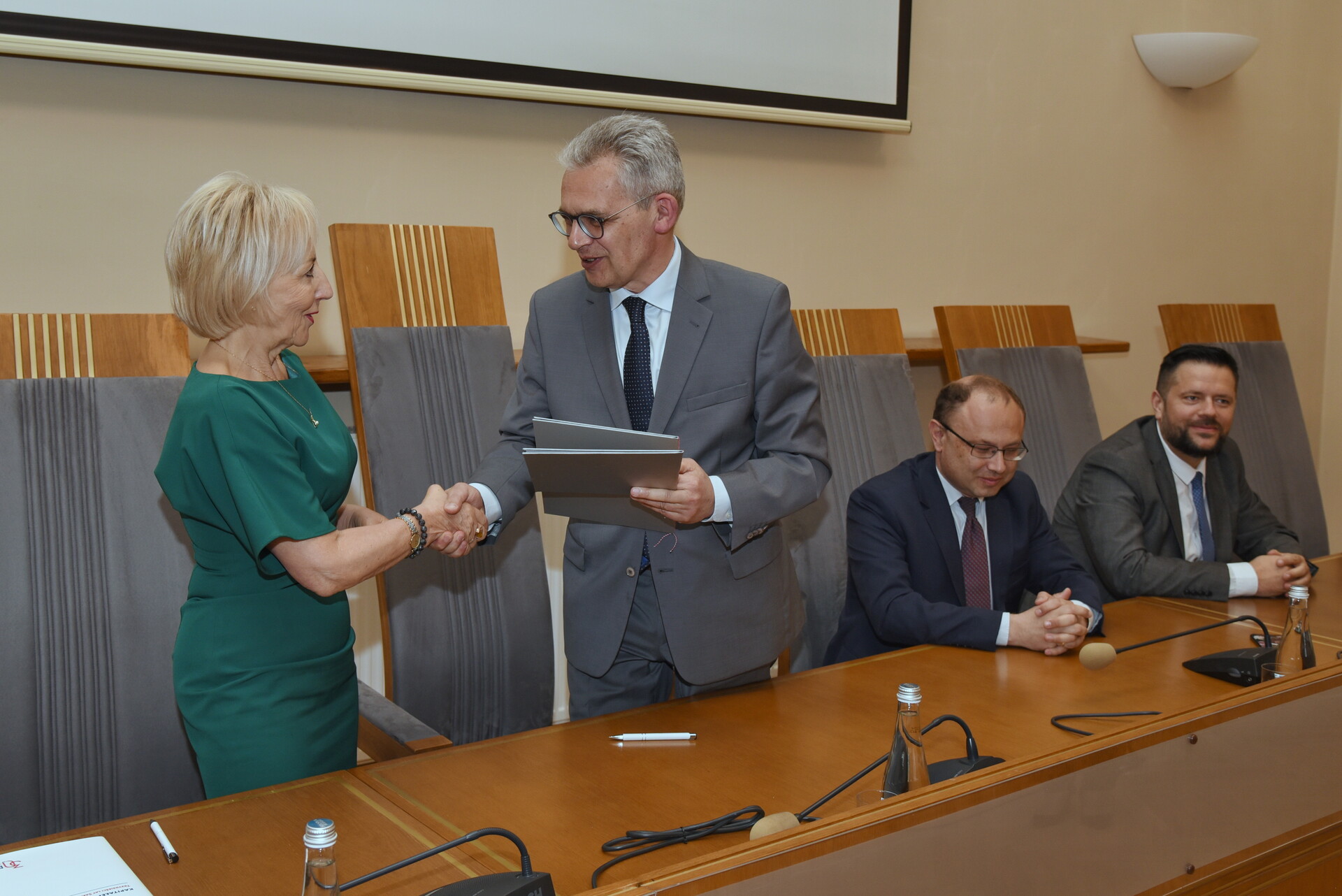 od lewej: prezes PIBR Barbara Misterska-Dragan, Rektor Uniwersytetu Zielonogórskiego prof. dr hab. Wojciech Strzyżewski, dr hab. Piotr Kułyk, prof. UZ – dziekan Wydziału Ekonomii i Zarządzania, dr inż. Leszek Kaźmierczak-Piwko – prodziekan Wydziału Ekonomii i Zarządzania, fot. K. Adamczewski