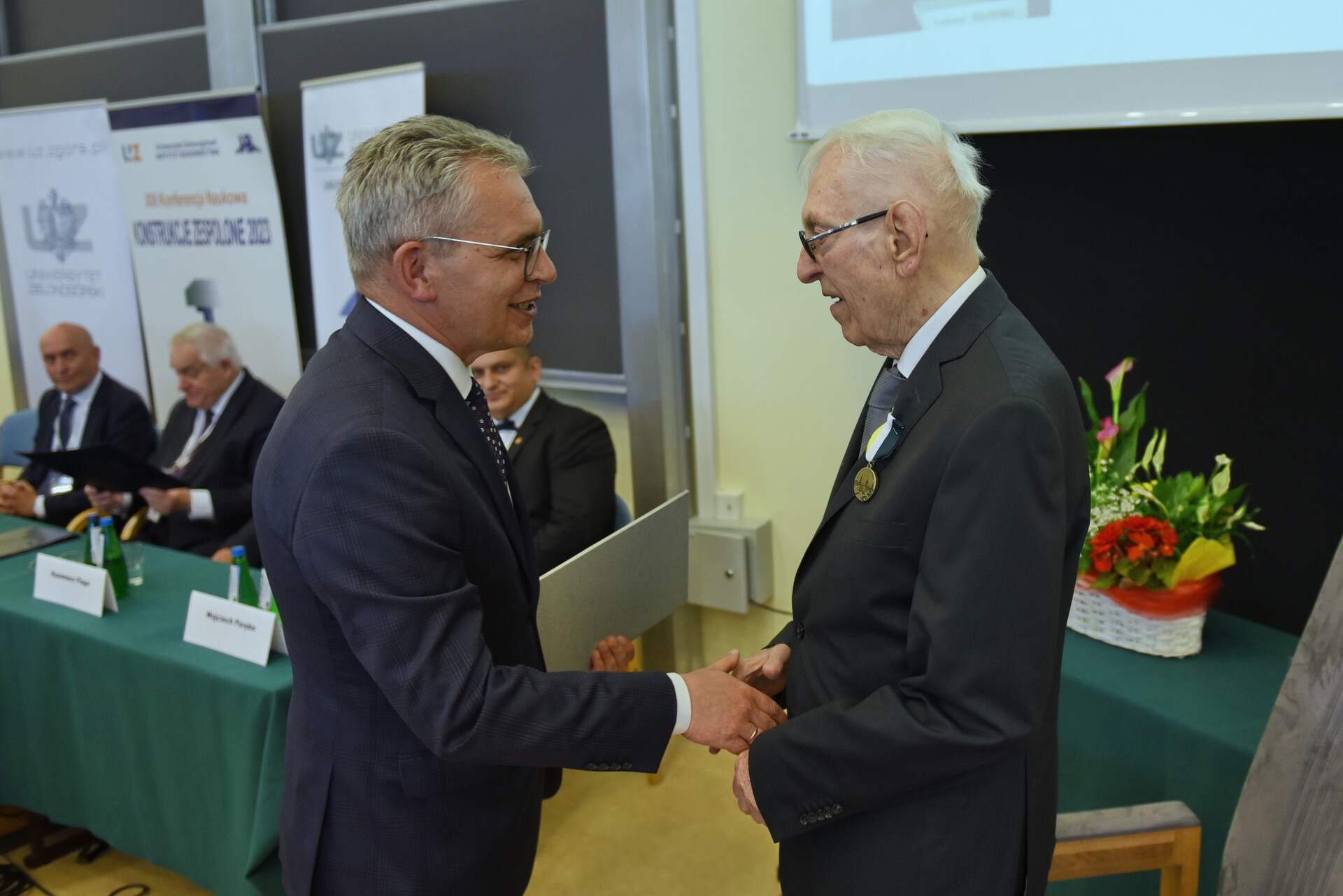 Rektor Uniwersytetu Zielonogórskiego - prof. dr hab. Wojciech Strzyżewski składa życzenia prof. dr. hab. inż. Tadeuszowi Bilińskiemu; fot. K. Adamczewski