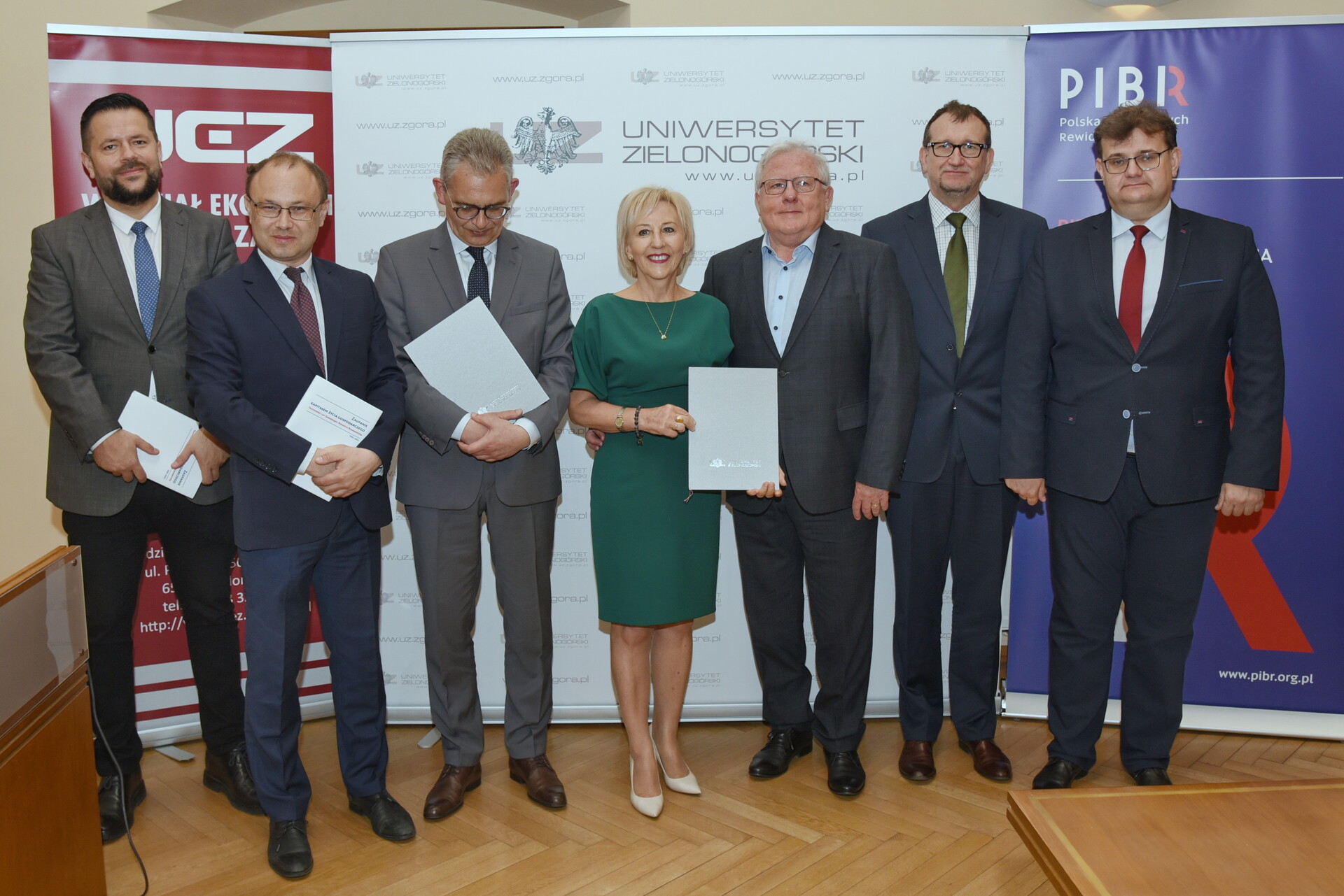 od lewej: dr inż. Leszek Kaźmierczak-Piwko – prodziekan Wydziału Ekonomii i Zarządzania, dr hab. Piotr Kułyk, prof. UZ – dziekan Wydziału Ekonomii i Zarządzania, Rektor Uniwersytetu Zielonogórskiego prof. dr hab. Wojciech Strzyżewski, prezes PIBR Barbara Misterska-Dragan, Jacek Wegner – były Prezes Regionalnego oddziału PRIB w Zielonej Górze, Jacek Korzyb – Prezes Regionalnego oddziału PRIB w Zielonej Górze, Piotr Ostręga - sekretarz Regionalnego oddziału PRIB w Zielonej Górze, fot.K.Adamczewski