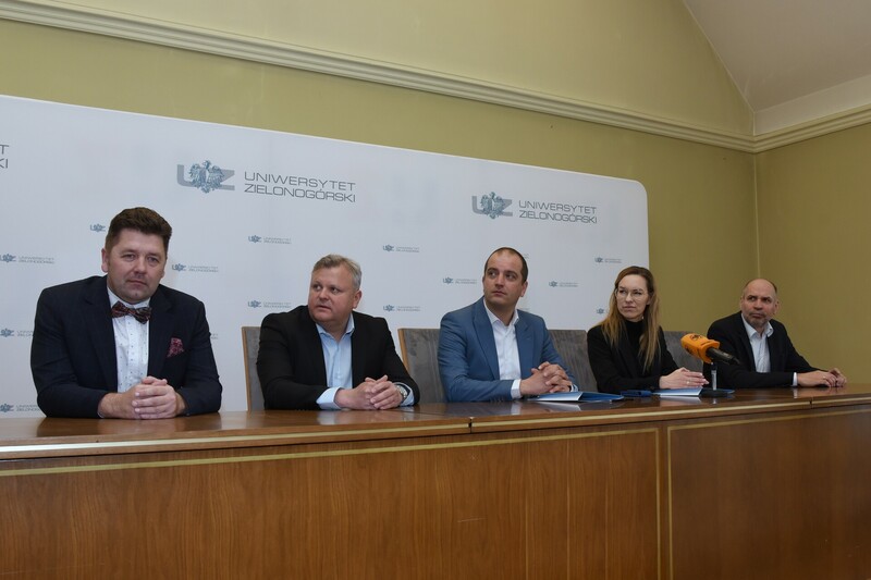 Od lewej siedzą: dr hab. inż. Radosław Maruda, prof. UZ - p.o. dyrektor Instytutu Inżynierii Mechanicznej, Jacek Kuchta - członek Zarządu firmy Smulders Projects Poland Dieter Weyns - prezes Zarządu firmy Smulders Projects Poland, prof. dr hab. inż. Justyna Patalas-Maliszewska prorektor ds. współpracy z gospodarką UZ, dr hab. inż. Sławomir Kłos, prof. UZ, Pełnomocnik Rektora UZ ds. Jakości Badań Naukowych; fot. K. Adamczewski