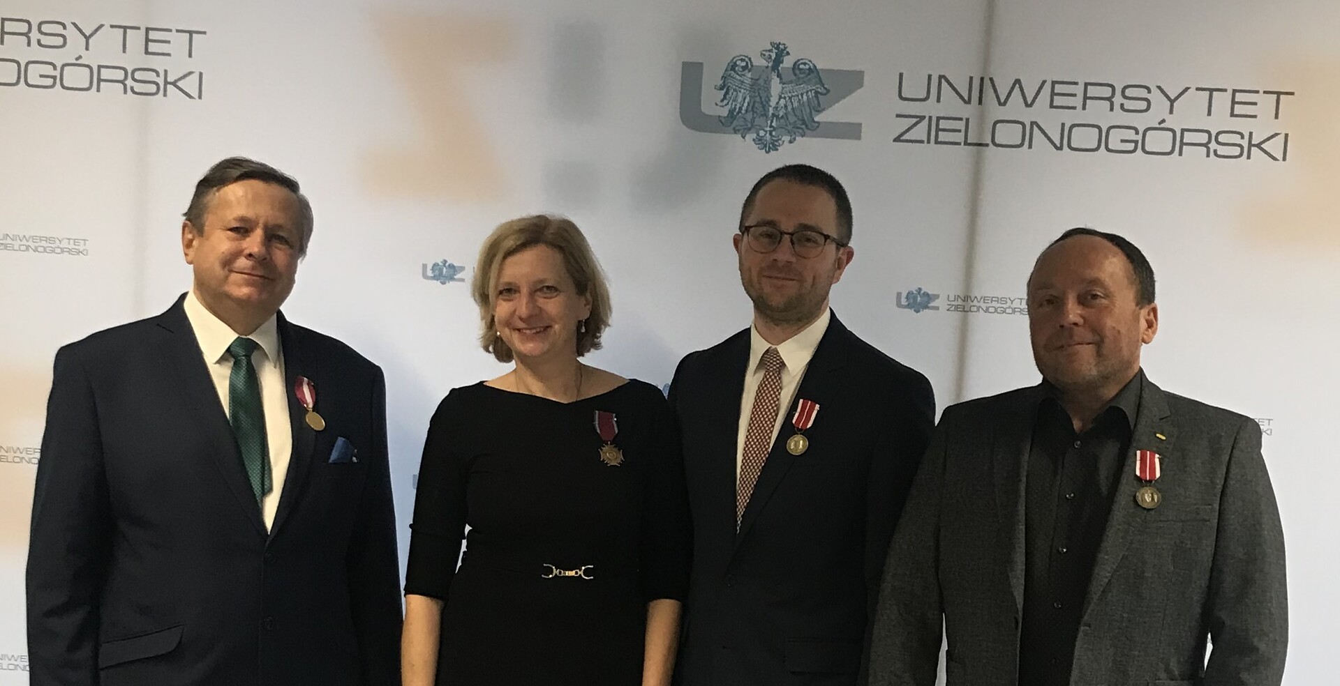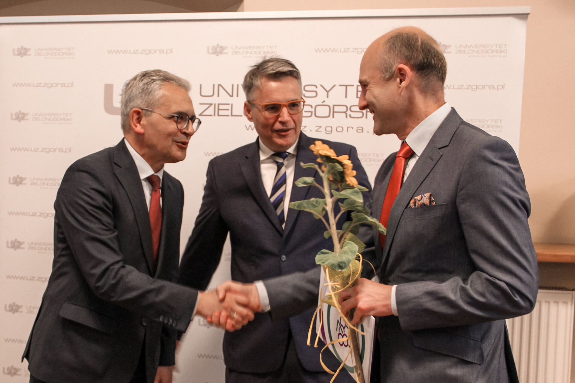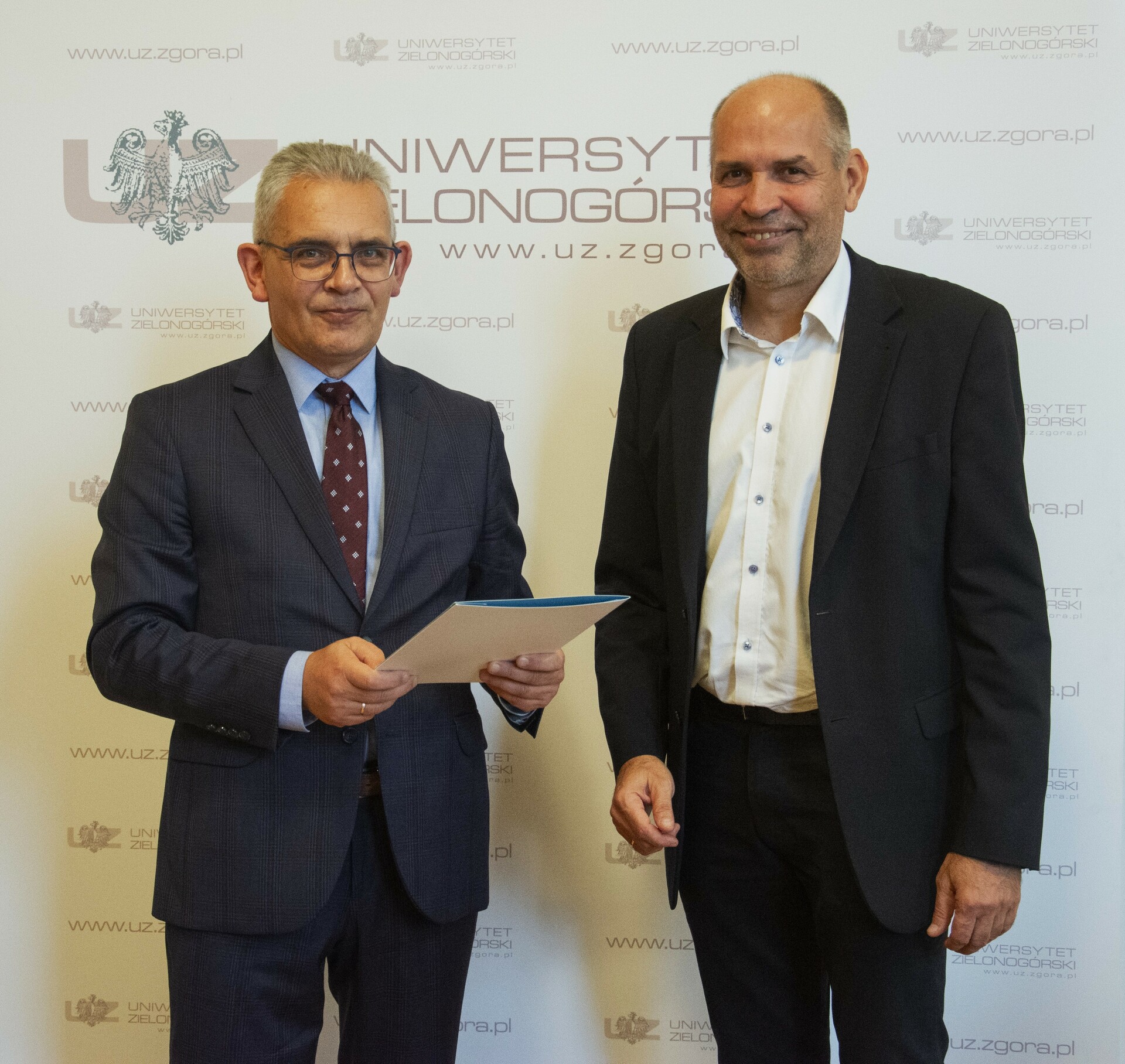 Rektor Uniwersytetu Zielonogórskiego - prof. dr hab. Wojciech Strzyżewski oraz Prezydent Miasta Zielona Góra - Janusz Kubicki wręczają nagrodę dr. hab. n. med. Maciejowi Salagierskiemu; fot. J. Czarnecka