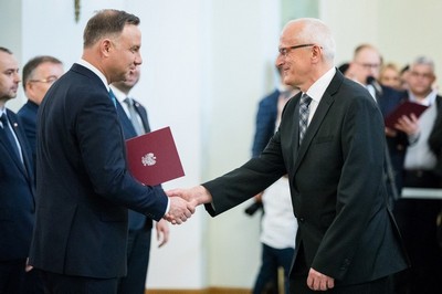 Moment wręczenia nominacji profesorskiej dr. Zbigniewowi Fickowi przez Prezydenta RP Andrzeja Dudę. Fot. Materiały prasowe Pałacu Prezydenckiego.