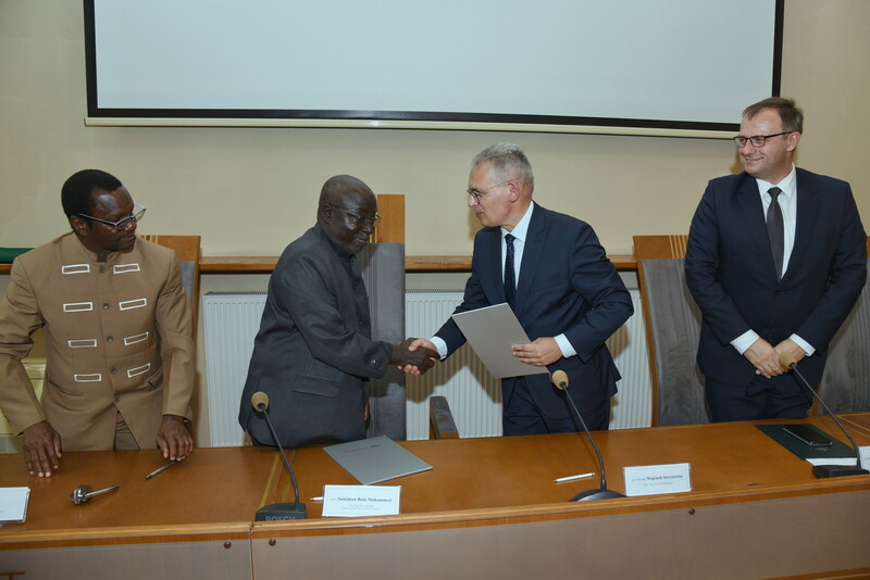Prof. dr hab. Wojciech Strzyżewski i Prof. Suleiman Bala Mohammed podają sobie dłonie po podpisaniu umowy; fot. K. Adamczewski